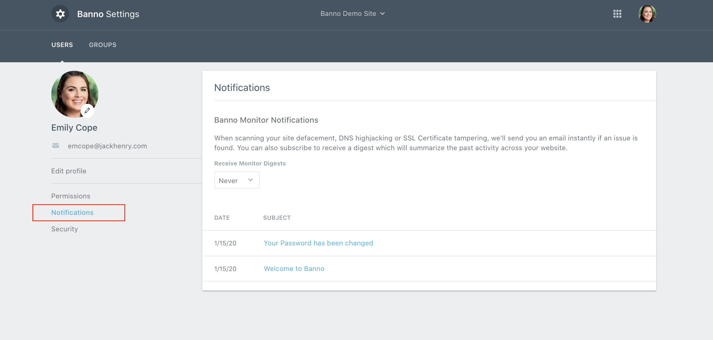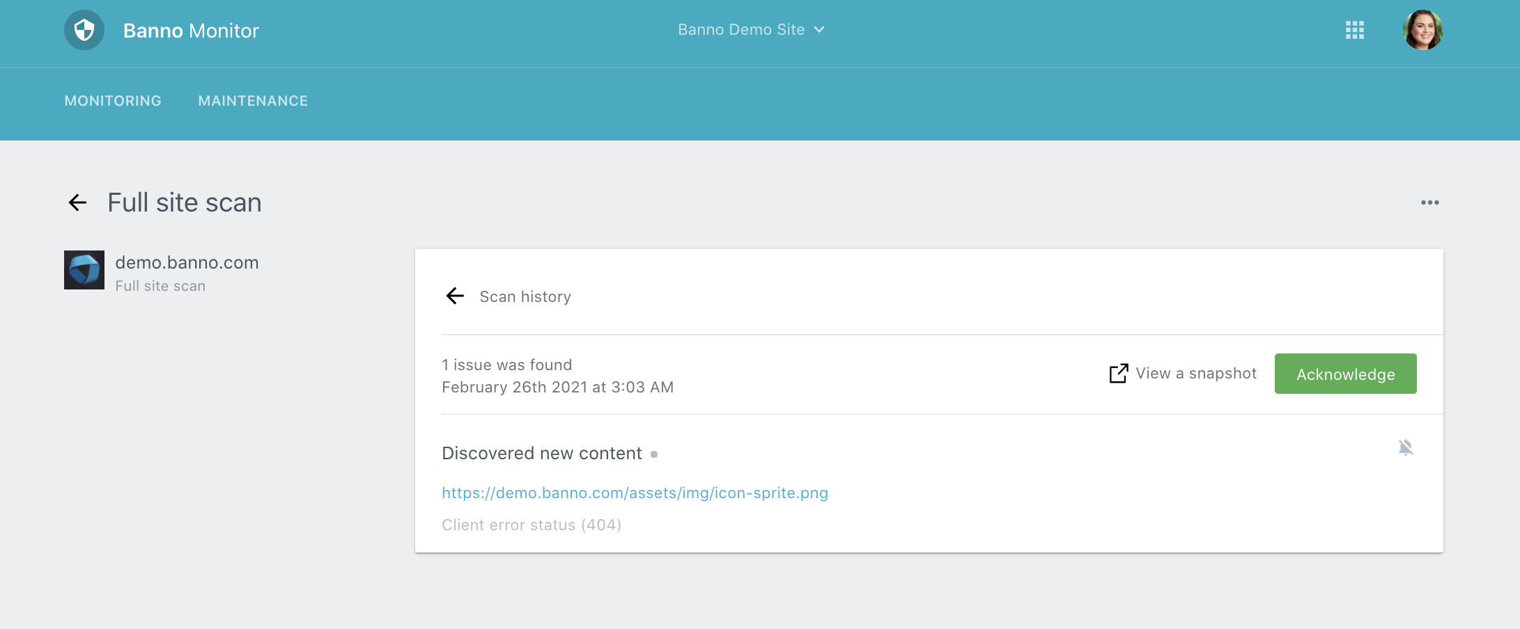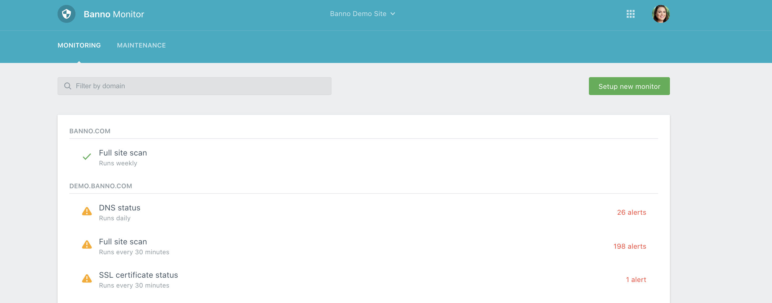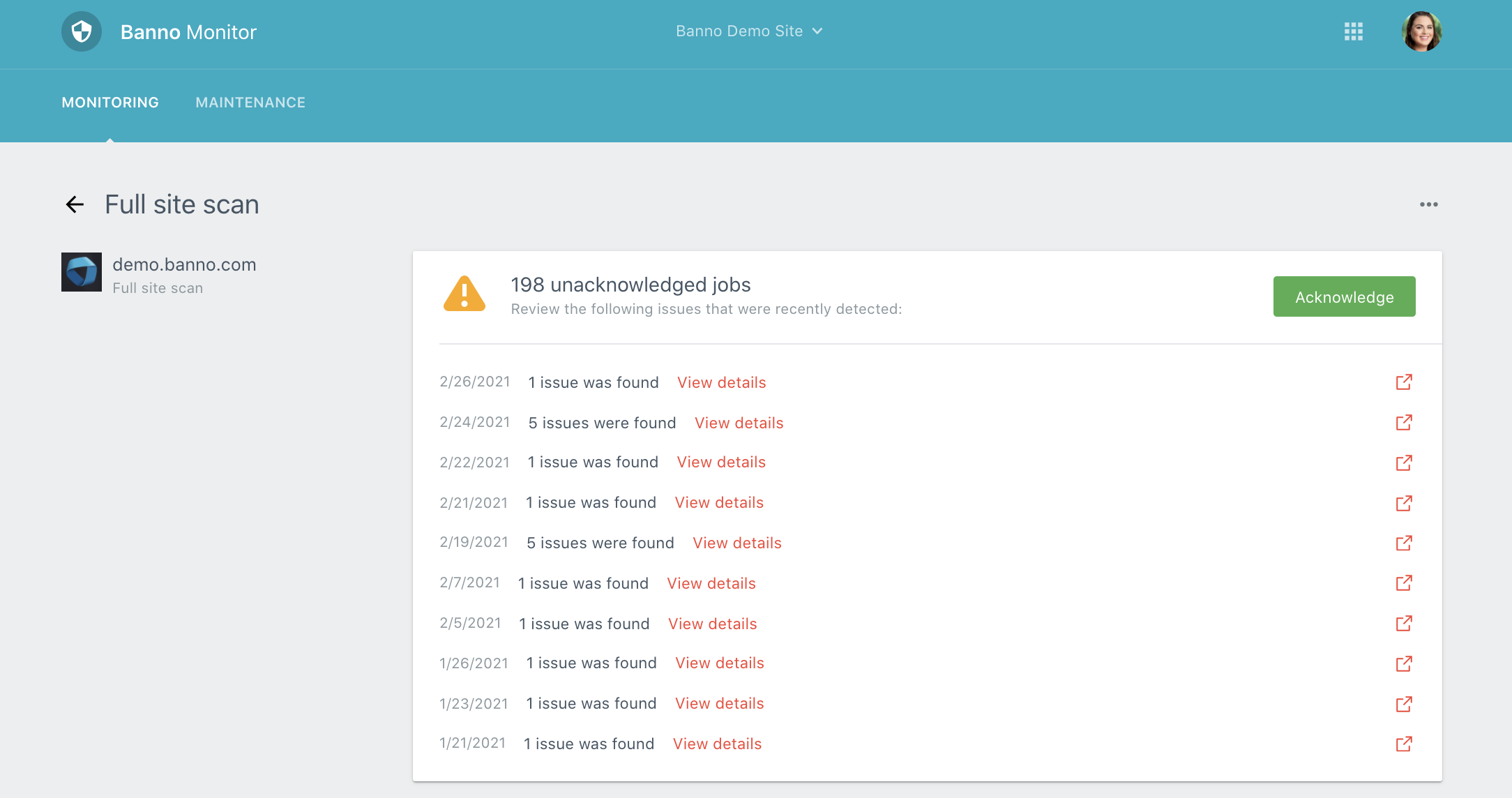 Banno Monitor is a service we offer for our Web Solutions clients. Monitor scans clients’ sites for any changes that they may need to be made aware of. While we scan all our sites on our servers for our own security, Monitor allows clients’ access to track this information themselves. Monitor scans on three fronts: it tracks their SSL certificate, their DNS and domain expiration, and their site content. If it sees anything off, it will alert the client, allowing them to review the alert and either acknowledge it (essentially turning off the alert) or they can reach out to us to investigate alerts further. In most of these cases, the changes that trigger alerts are legitimate and can be acknowledged.