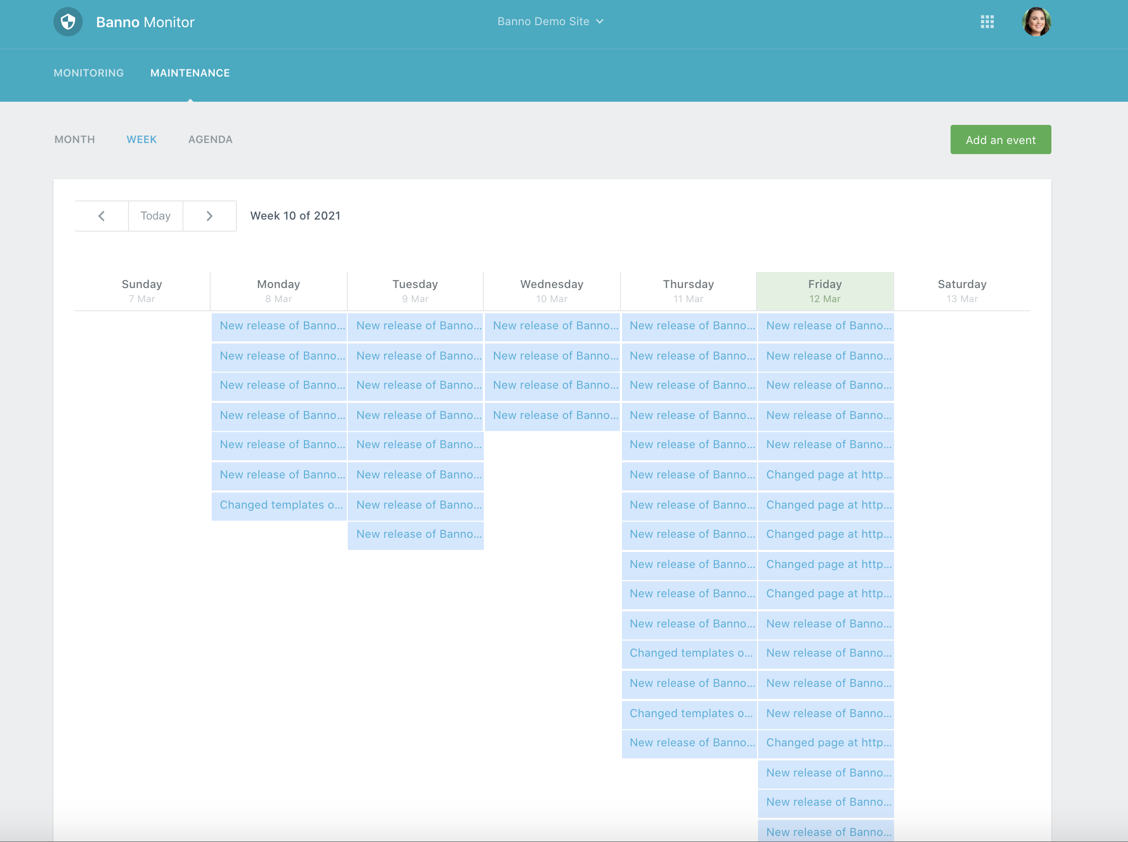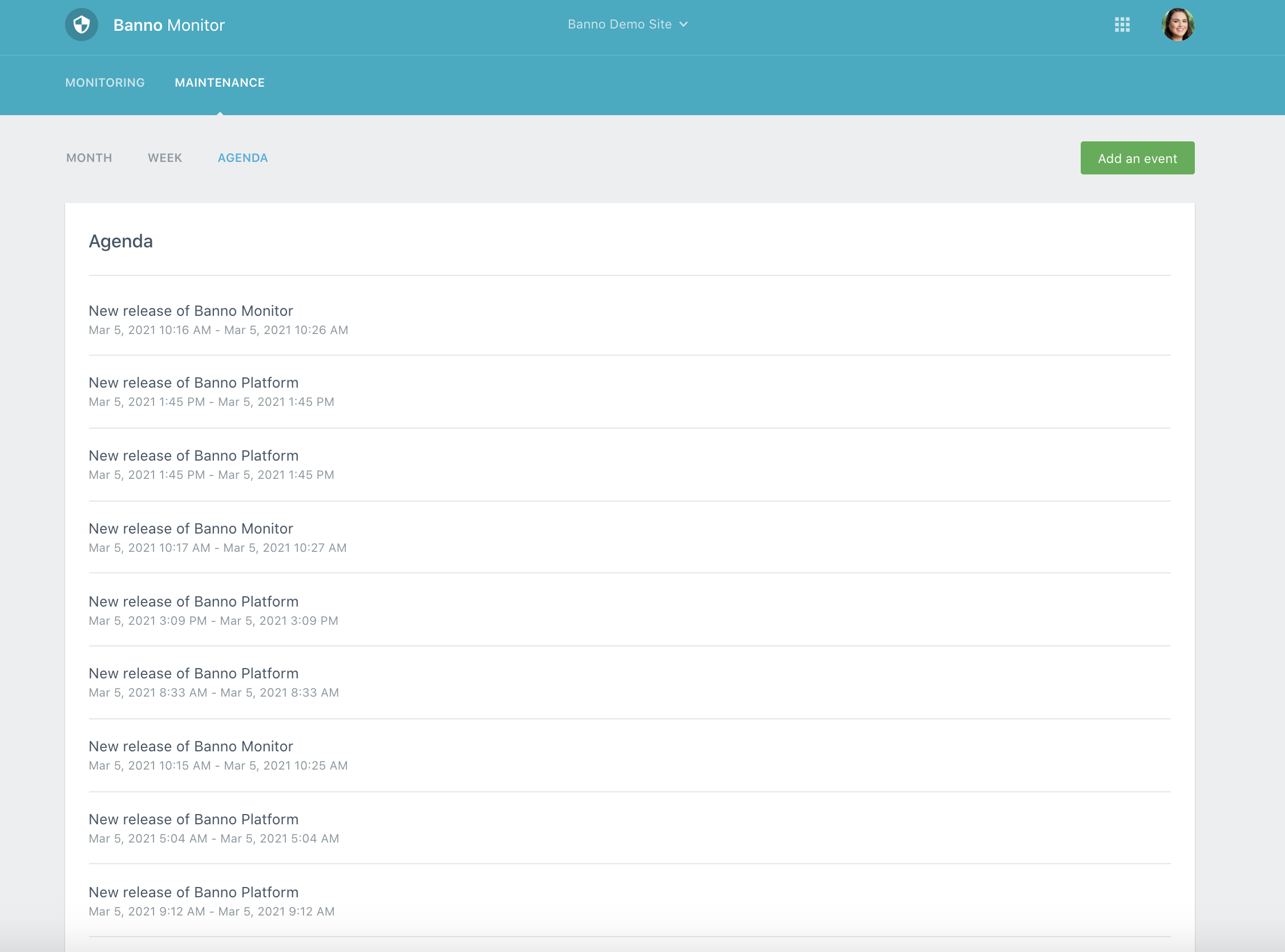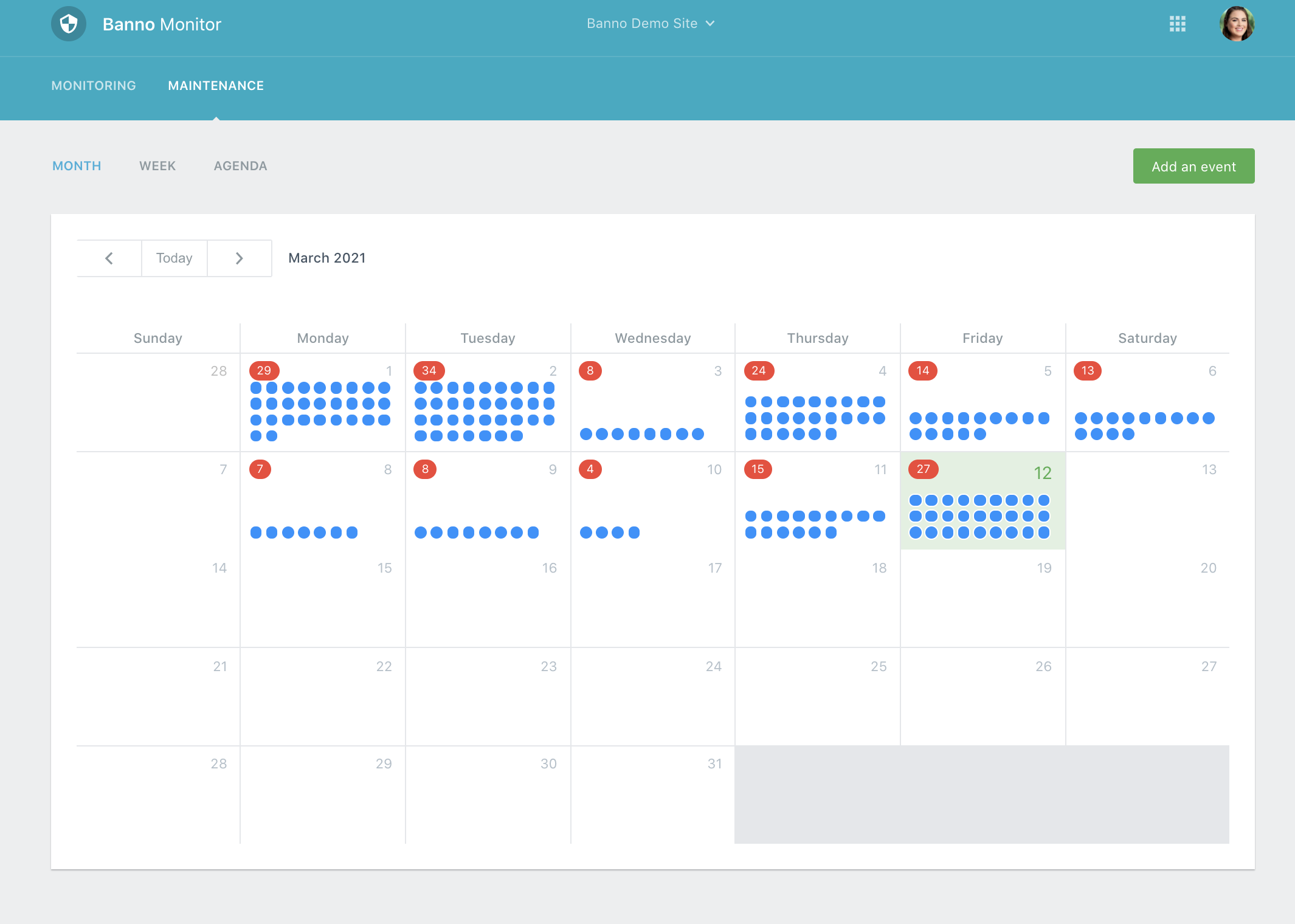 There is a second tab, labeled “Maintenance.” This is a calendar showing all the scheduled maintenance in Banno.