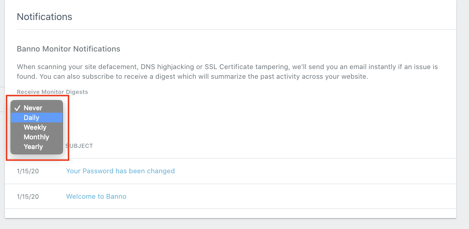 There, the client can set themselves up for Monitor Digests and decide their frequency (daily, weekly, monthly or yearly):