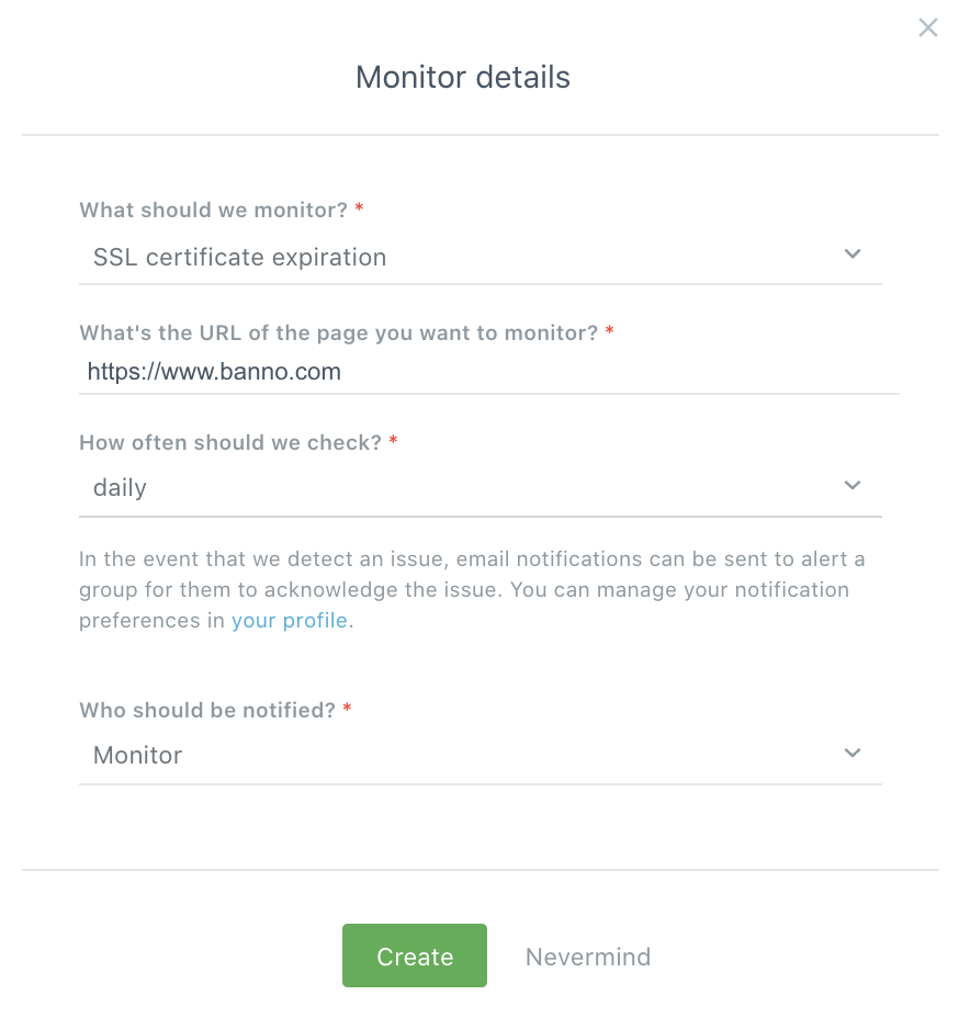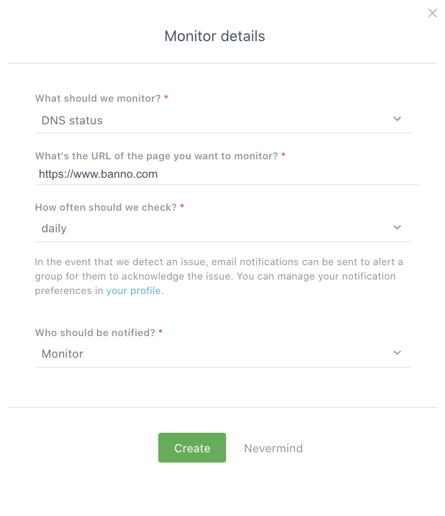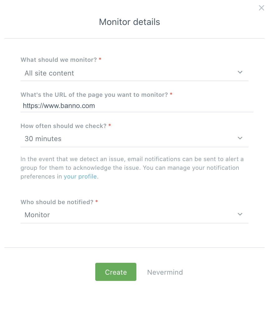 - What’s the URL of the page you want to monitor? The full URL of the site (this might be auto-populated).