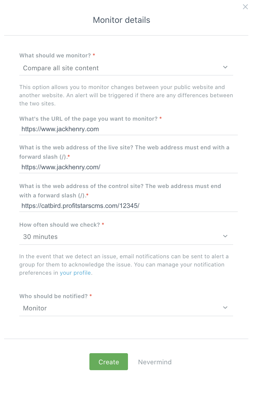- Please note: You do need the “/” at the end of the URLs when adding the “Compare all site content” monitor.