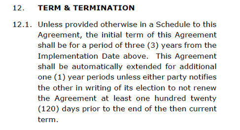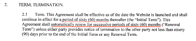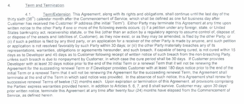 • Their initial term agreement was for 5 years and will automatically renew for an additional 5 years unless they send a notice of termination 90 days prior to end of term.