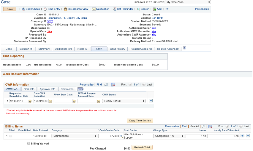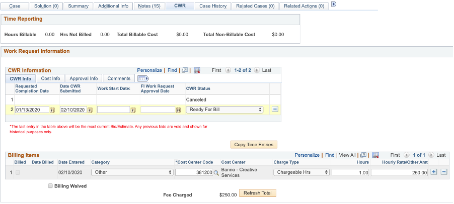 - ii. Change CWR Status to Ready for Bill