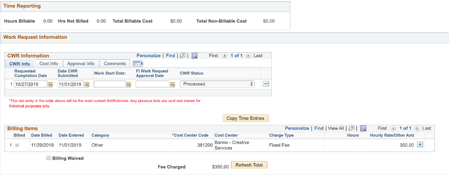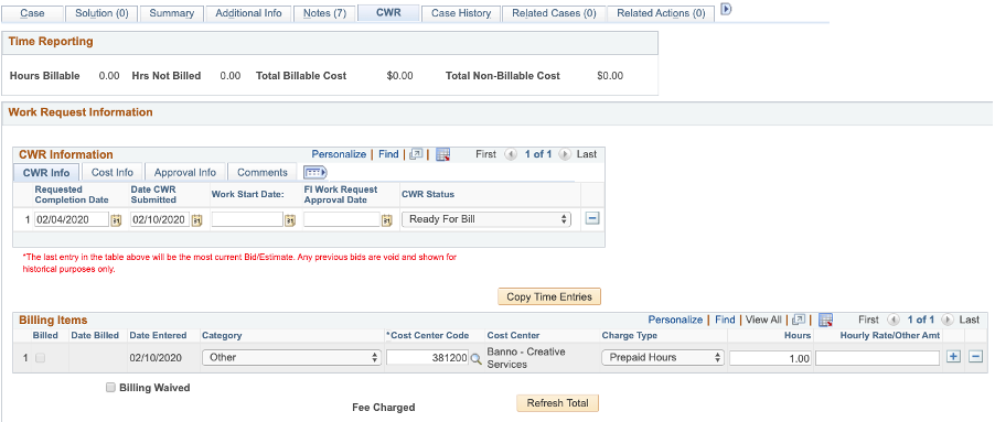 - T. If billing a flat fee (ex. After Hours Fee), go directly to the CWR Tab