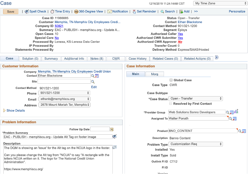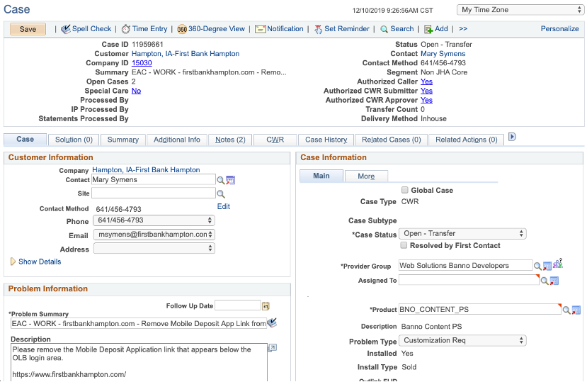 - vii. On the Case tab, change the Status to Open-Transfer