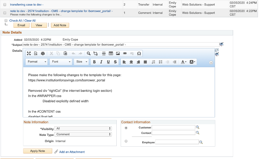 - i. Add a note to dev with all the info necessary for the developer to complete the request