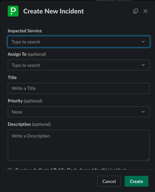 Give a brief but informative title and description. “Help” and “Service Down” and similar generics are not helpful. Remember: you’re sending a message to someone’s phone. They may be eating a meal, or fast asleep. You want to give them enough useful information – description of the problem, what Slack channel to join, and anything else immediately relevant – that they can arrive reasonably prepared to help you!