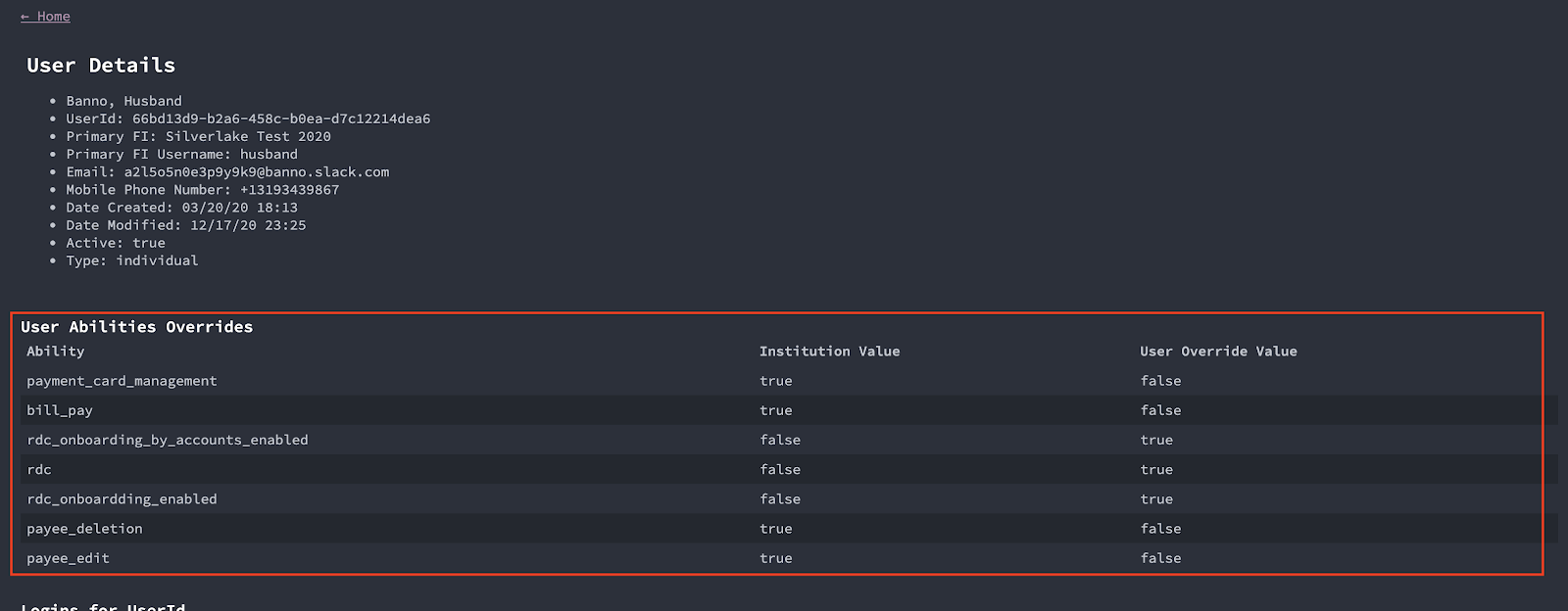 - This is not the full current setting of abilities for the user but will list any abilities for the user_id that have been modified from what the institution has set.