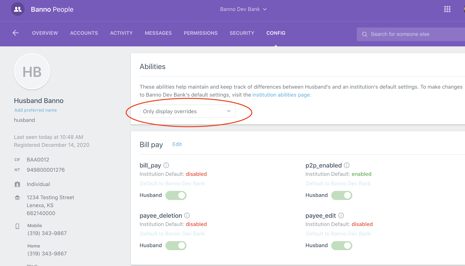 - This is not the full current setting of abilities for the user but will default to any abilities for the user_id that have been modified from what the institution has set. To show all abilities select Display all possible overrides from the drop down.