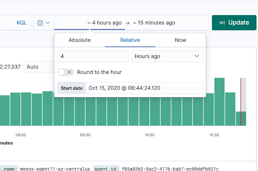 Kibana typically displays timestamps in your local time zone. If it’s not, you can change it in the Advanced Settings. DS Reporting timestamps are always UTC. That mismatch can be a pain.