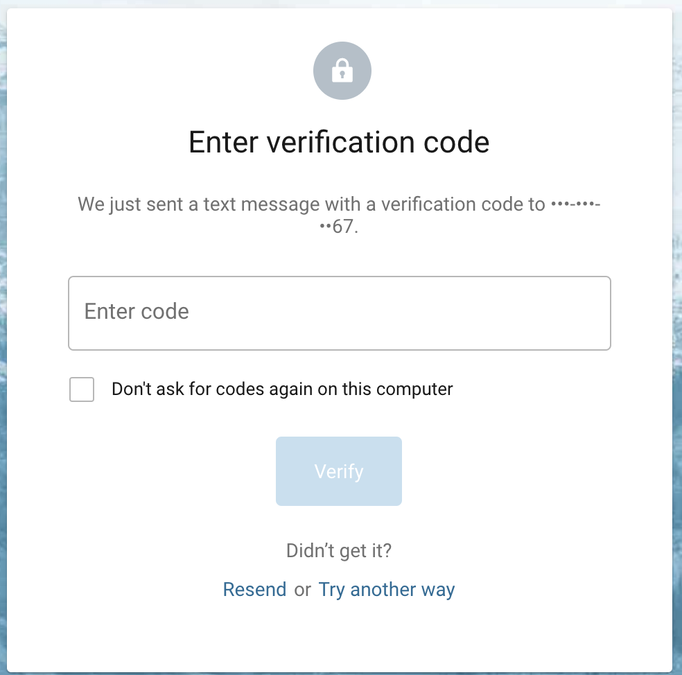 After entering credentials, if the user is enrolled in 2FA (and you aren’t using a trusted device) you’ll be presented with a masked version of the enrolled phone number: