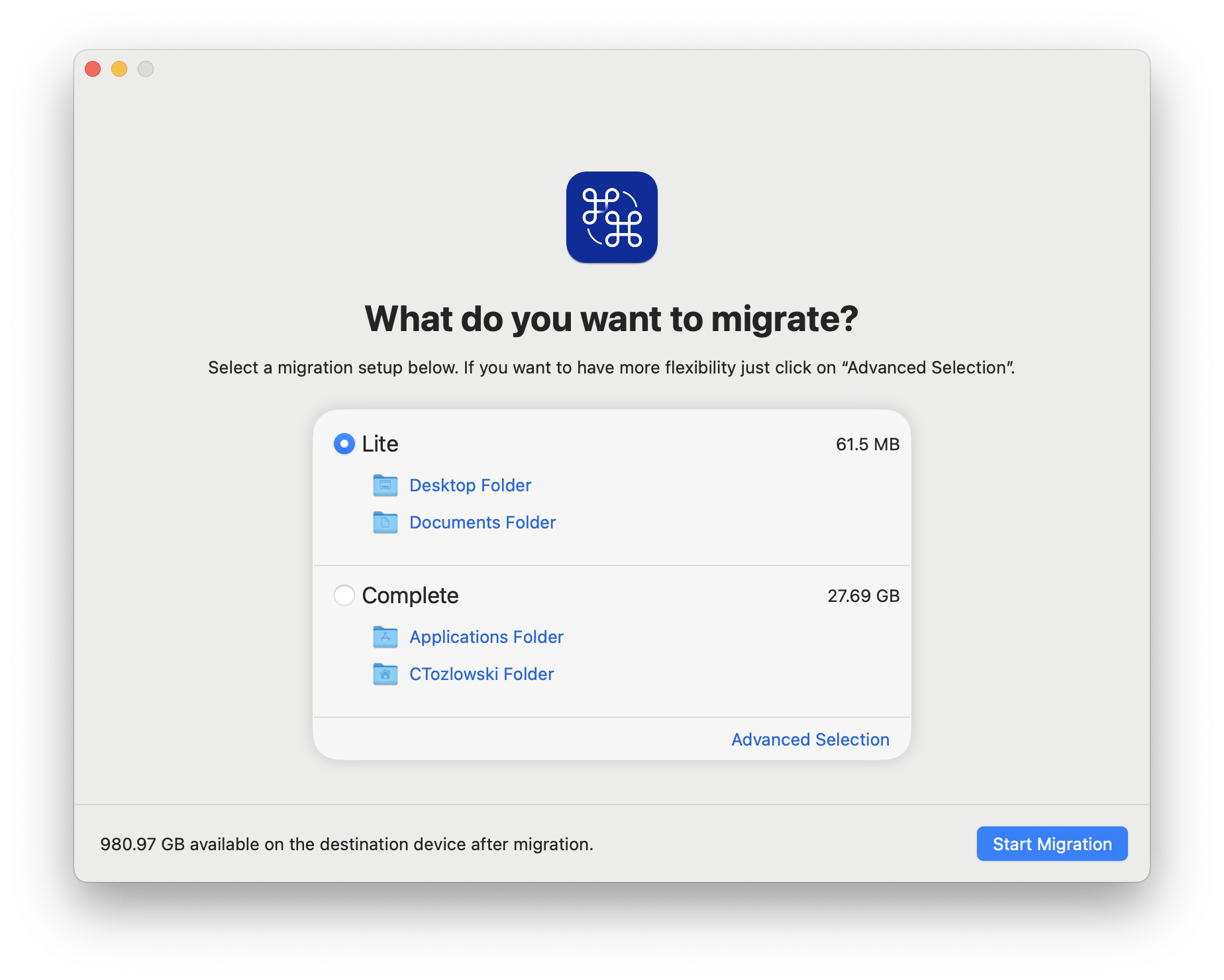 - On your old Mac, select which files you want to migrate. The Lite option will migrate only your Desktop and Documents folders. Complete will migrate your user folder (which includes your Desktop and Documents folders) and your Applications folder. You can also choose Advanced Selection to select specific files you want to transfer. Once you’ve decided, click “Start Migration”.