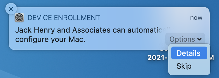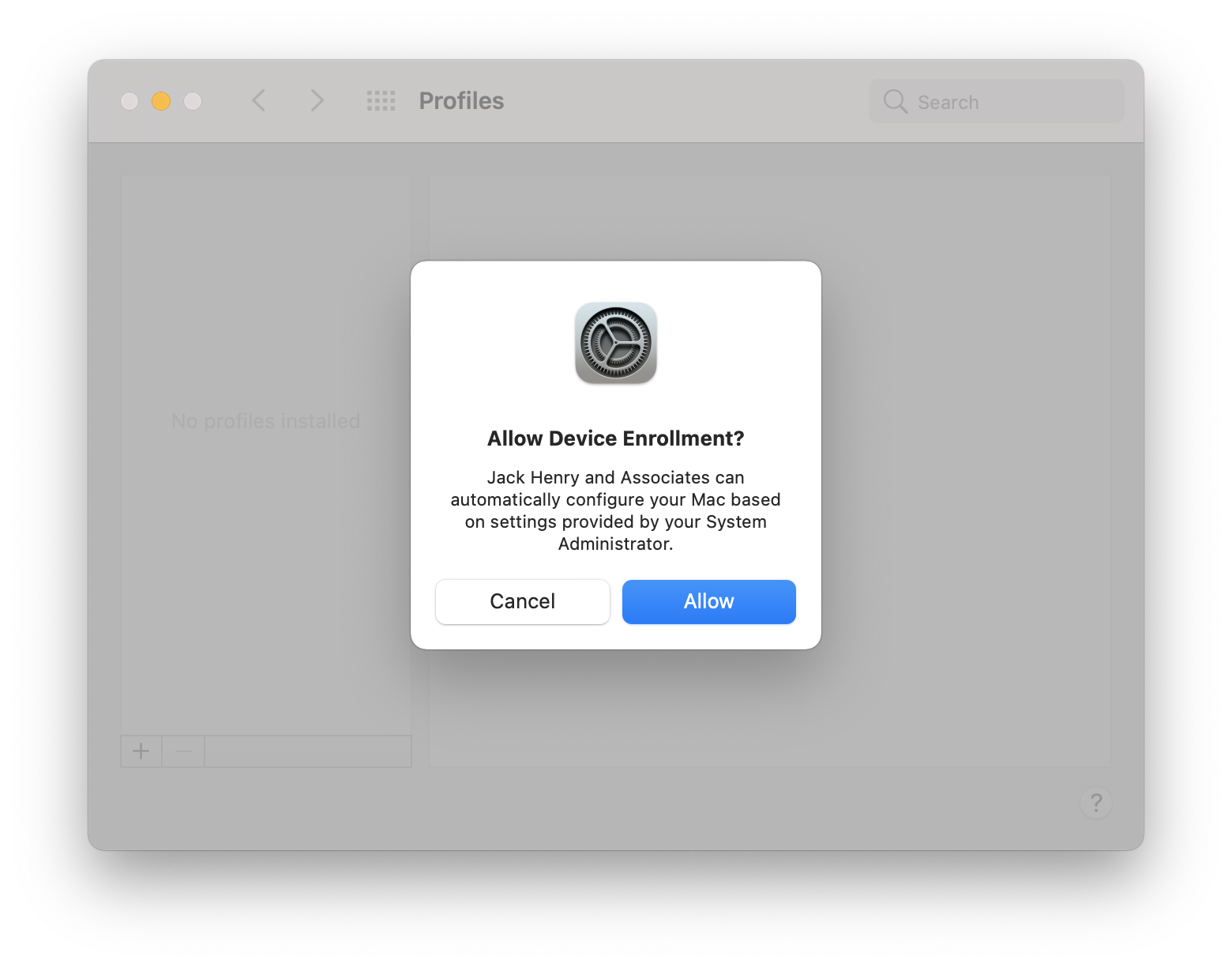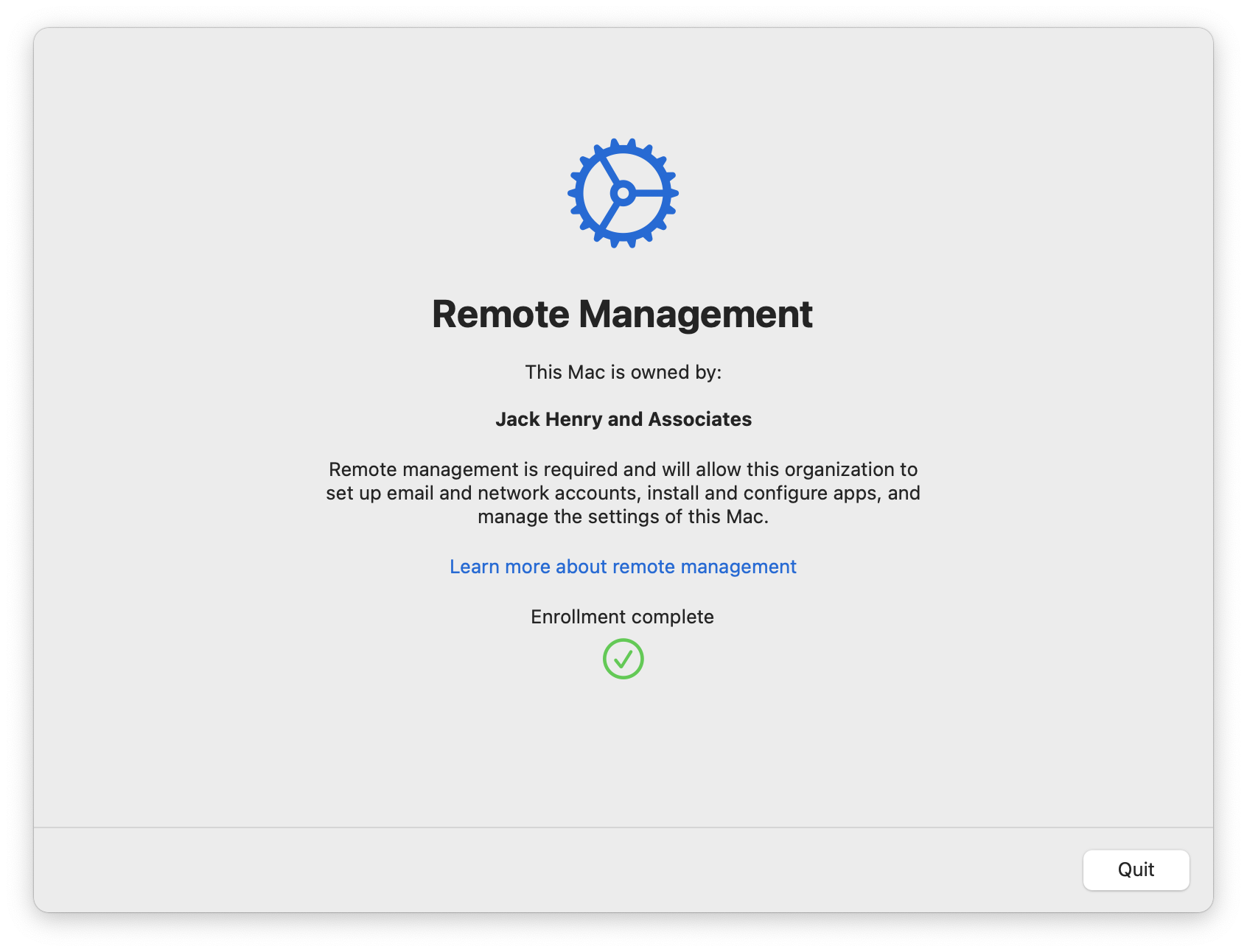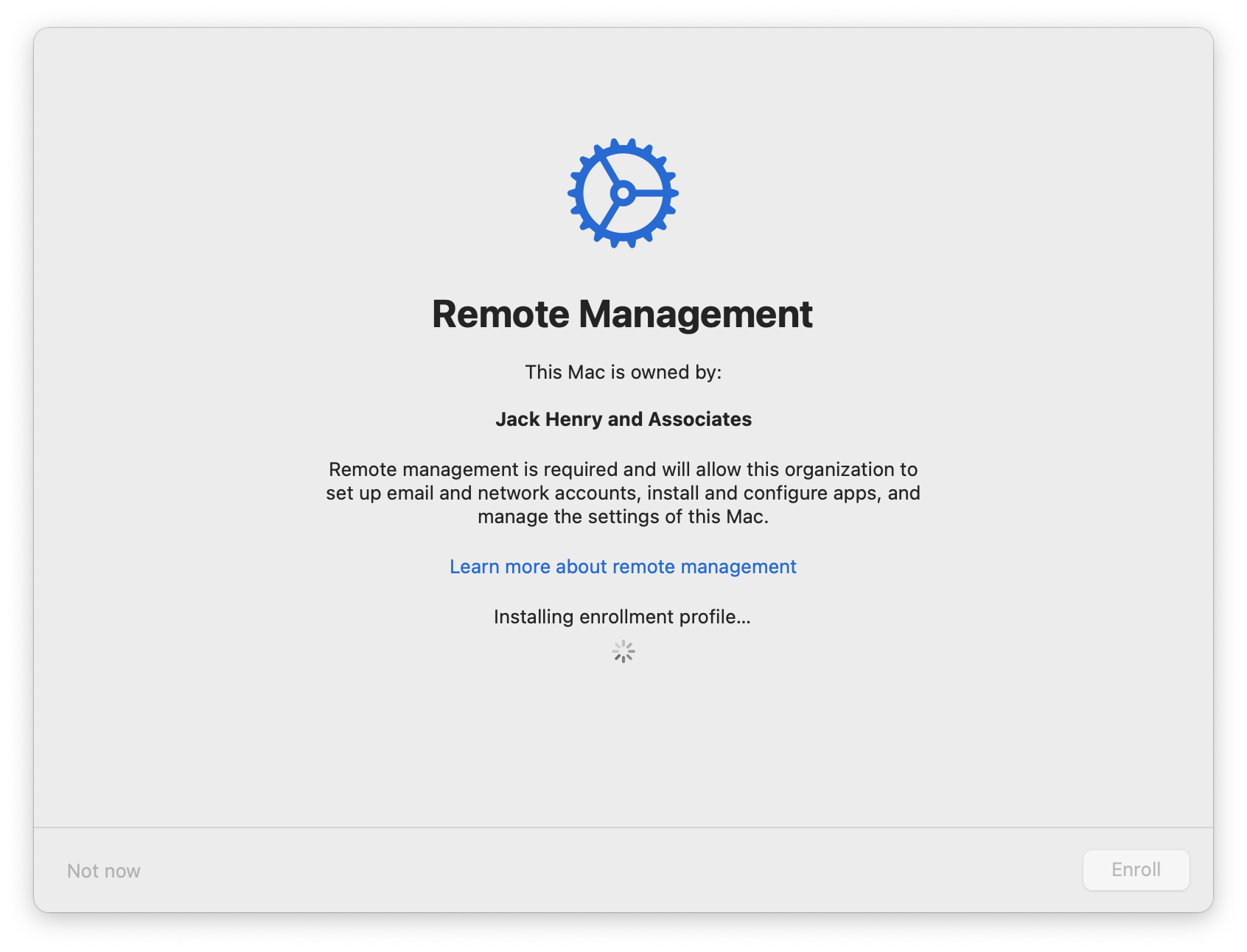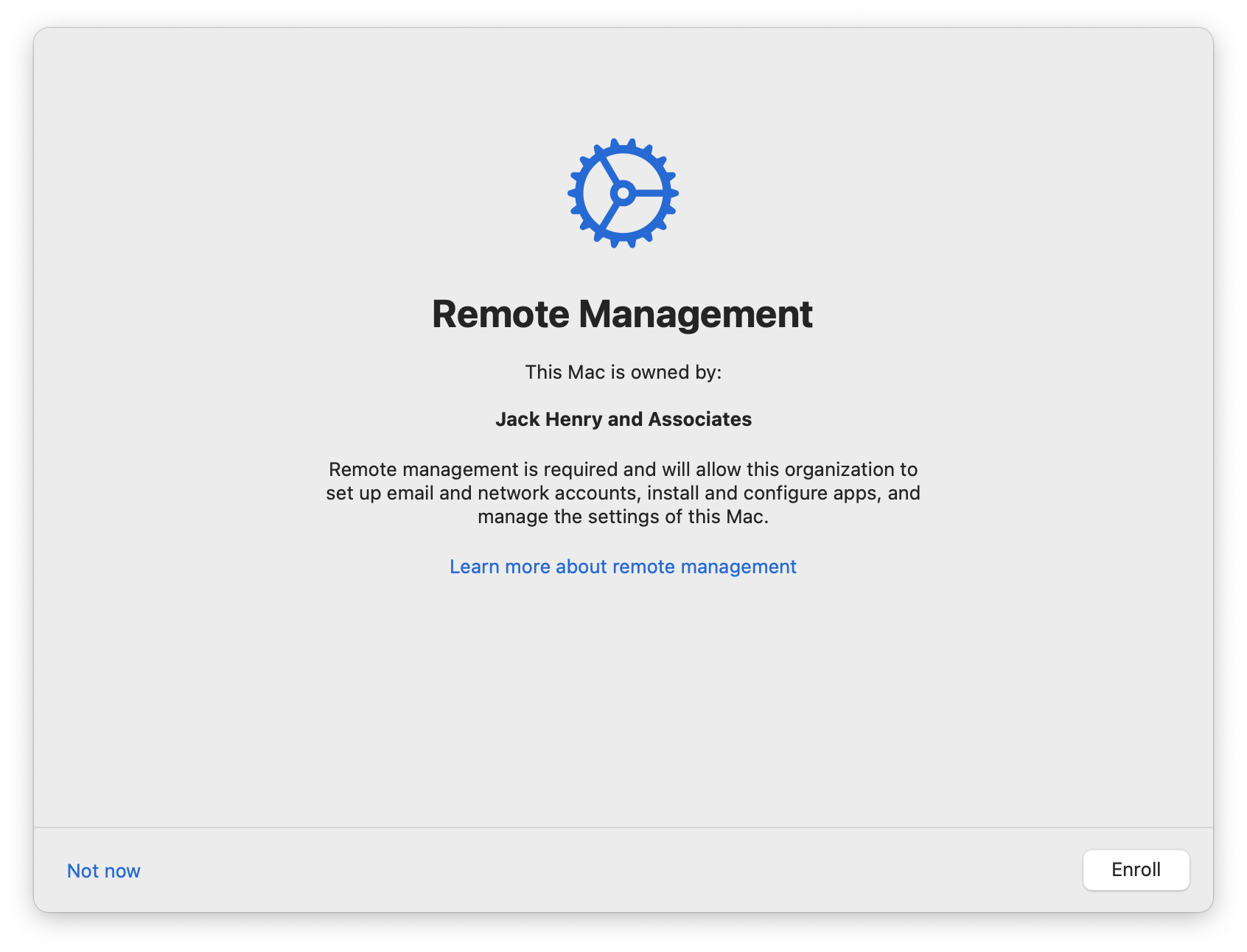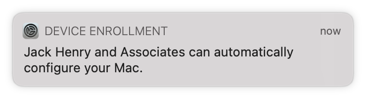 When prompted, enter your computer password to enroll in remote management. (From this point on, enrollment mirrors the process described here: https://docs.banno.com/new-mac/#initial-macos-setup)